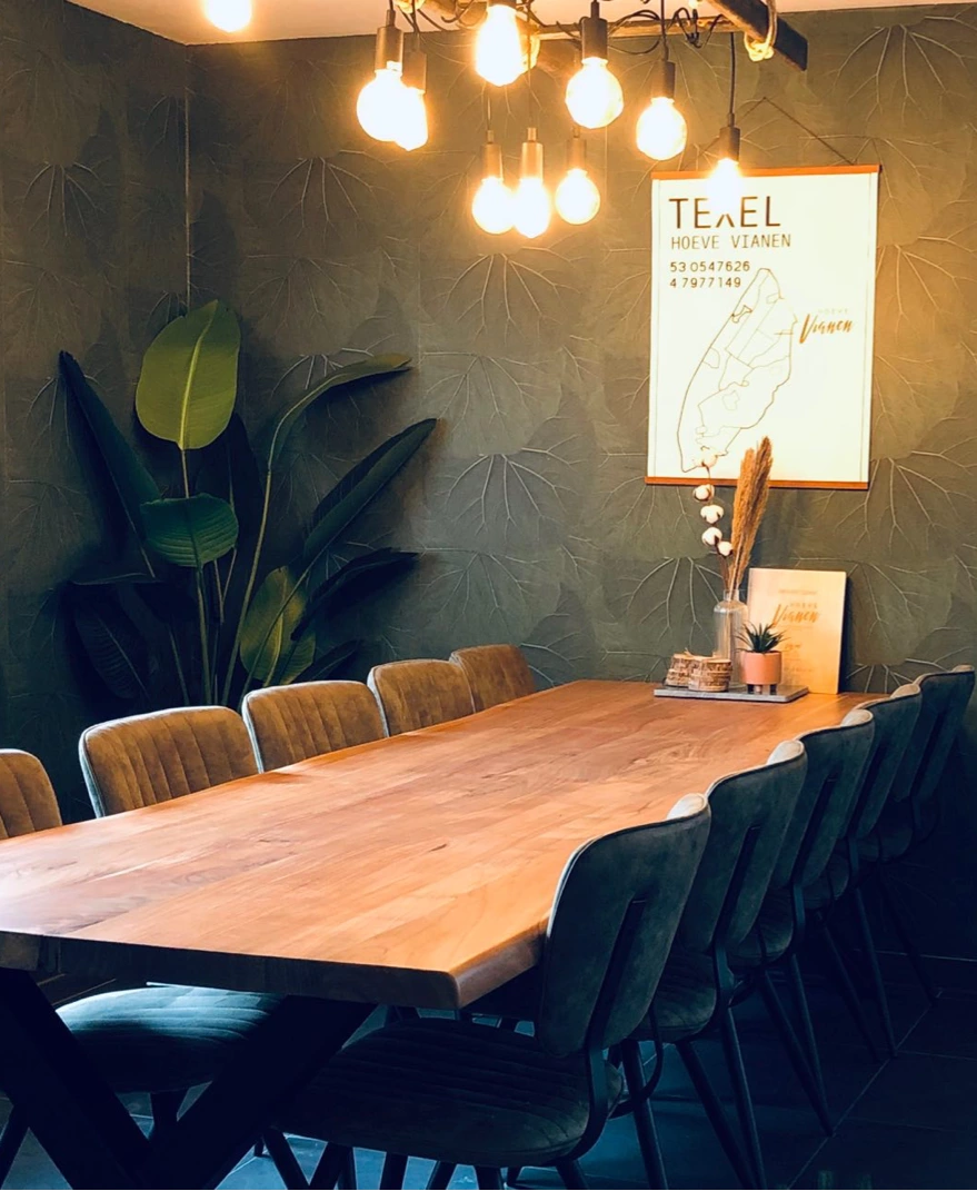 Ein besonders schöner Platz im Haus ist der großzügige Essbereich, der dafür gedacht ist, Menschen zusammenzubringen. Hier gibt es genügend Sitzplätze für alle. Der drei Meter lange „Stammtisch“ in der Farm Lodge De Slufter ist großzügig bemessen und lädt dazu ein, gemeinsam zu essen, Spiele zu spielen oder einfach gemütlich über den Tag zu plaudern. Denn mal ehrlich: Gemeinsam Erinnerungen schaffen und teilen – darum geht es doch eigentlich?